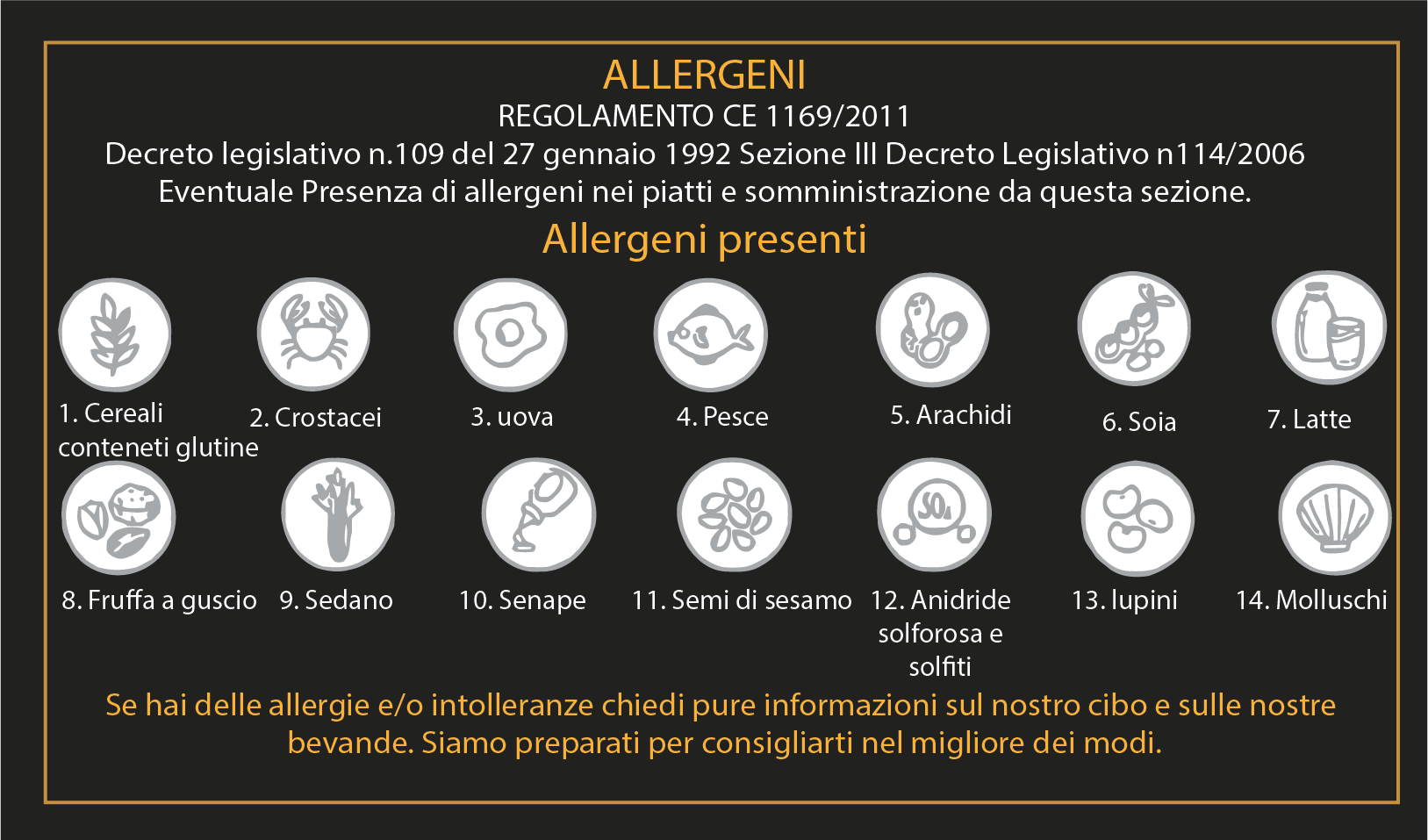 se hai delle intolleranze, chiedi ad un nostro collaboratore la lista ingredienti con specificati i relativi allergeni